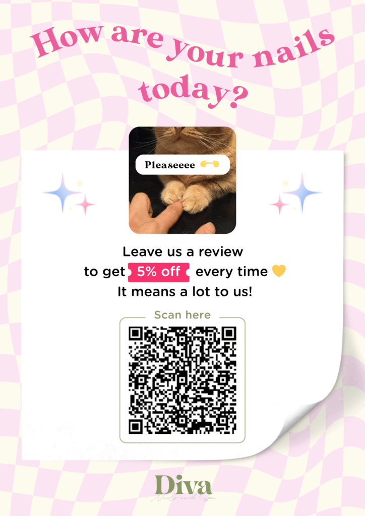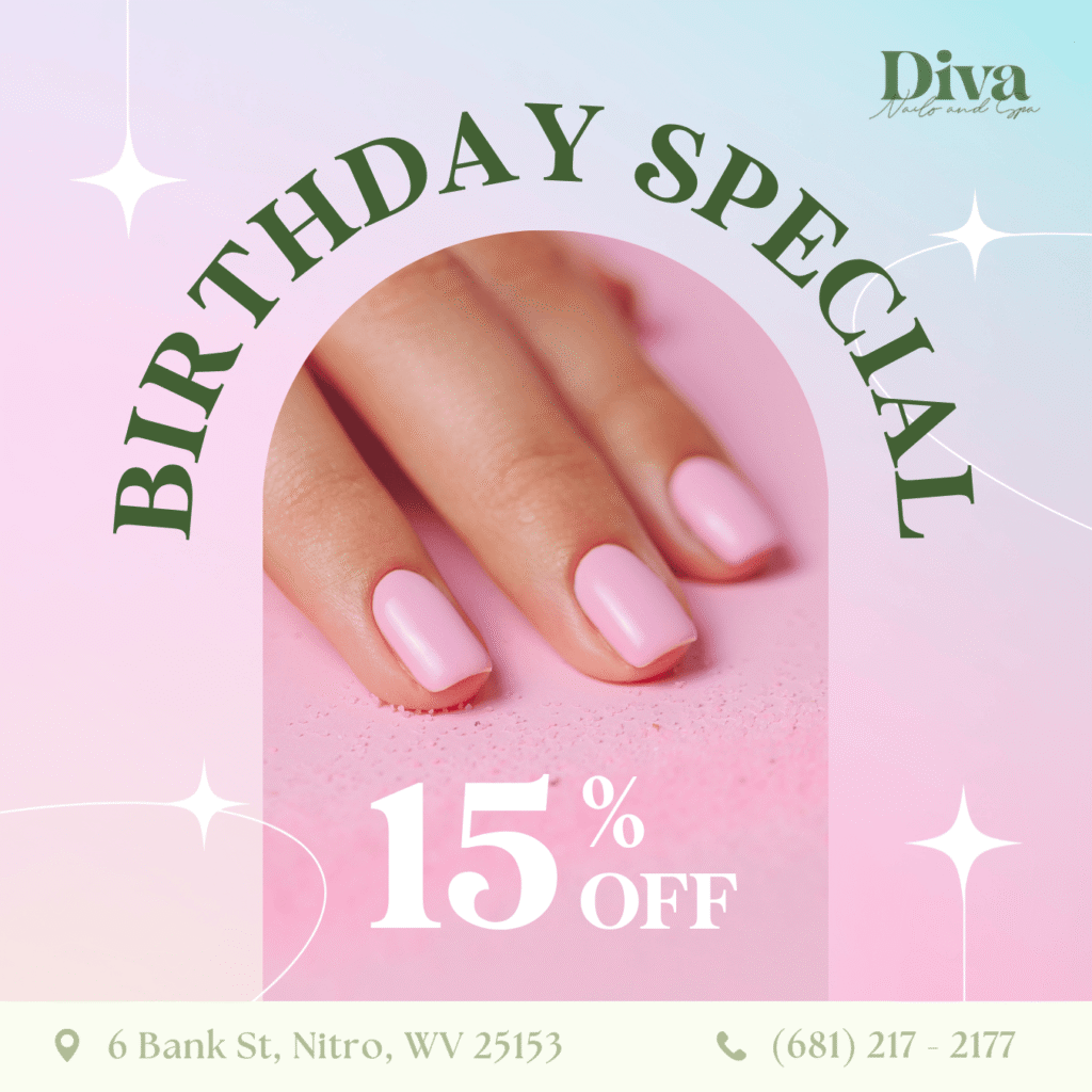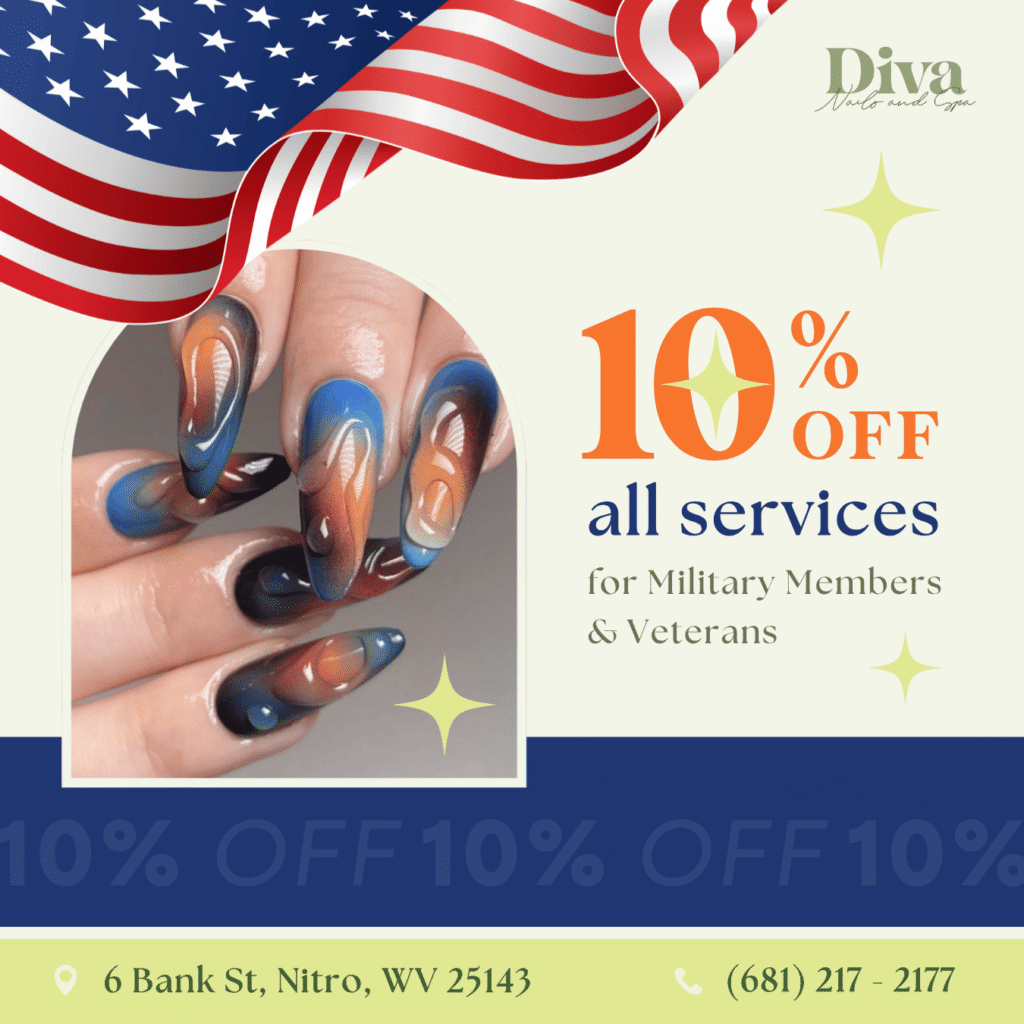 Diva Nails & Spa Deals & Promotion Beauty club Collect points every visit and unlock bigger perks as you go.Each appointment earns 2% toward your Beauty Club level, helping you reach exclusive rewards and cash bonuses faster 🌿 1% 3% 5% 7% 10% 12% 15% 17% 20% Cash reward Pay in cash and save more. Every cash payment earns $2 in rewards that build toward your next bonus. $1 $3 $5 $7 $10 $12 $15 $17 $20 Free Gel Polish Special Enjoy a free gel polish with any Spa Pedicure ($15 OFF)Available on Mondays and Tuesdays only – simply show this poster at checkout to redeem. Honoring All Who Serve Enjoy 10% OFF all services for Military Members & VeteransThank you for your service, strength, and dedication Birthday Special It’s your special day!! Enjoy 15% OFF all services when you visit on your birthday. How are your nails today? Leave us a review to get 5% OFF every time 💛 It means a lot to us!